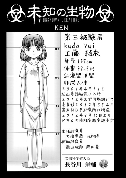 実験室にて非検体の少女と未確認生物との実験経過の記録が行われた。ヘビのような大きなミミズのような生物が何度も何度も少女のアソコへ挿入し少女は絶頂で失神を繰り返す。意識が戻らないので肛門から栄養を直接挿入し、その後少女のアソコから生み出されたものは…!?